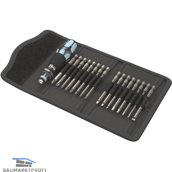 Falttasche mit 89 mm langen Bits. Inklusive Handhalter 3816 R Kraftform mit Schnellwechselfutter "Rapidaptor" und mehrkomponentigem Kraftform-Griff für ermüdungsarmes Arbeiten. Edelstahlausführung zur Vermeidung von Fremdrost. 17-teilig.