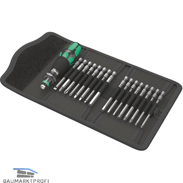 Falttasche mit 89 mm langen Bits. Inklusive Handhalter 816 R Kraftform mit Schnellwechselfutter "Rapidaptor" und mehrkomponentigem Kraftform-Griff für ermüdungsarmes Arbeiten. Kraftform Plus: Harte Griffzonen für hohe Arbeitsgeschwindigkeit, während weiche Griffzonen hohe Drehmomentübertragung garantieren. Für hand- und maschinenbetätigte Verschraubungen geeignet. 17-teilig.
