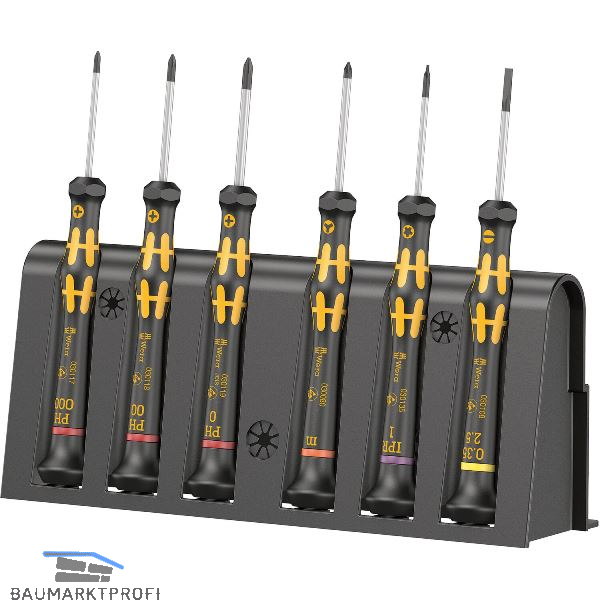 Elektrostatisch abgesicherter Wera Micro Schraubendrehersatz. Sicherer Schutz vor elektrostatischer Energie und damit verbundenen Schäden. Durch Abstützen der Hand auf der Drehkappe und durch die Schnelldrehzone unterhalb der Drehkappe ist blitzschnelles Zwirbeln möglich. Zeitintensives Umgreifen entfällt. Kraftzone mit integrierten Weichzonen sorgt für die Übertragung hoher Löse- und Anzugsmomente. Präzisionszone für den richtigen Drehwinkel bei Justierarbeiten. Die Wera Black Point-Spitze bietet Passgenauigkeit und optimierten Korrosionsschutz.
