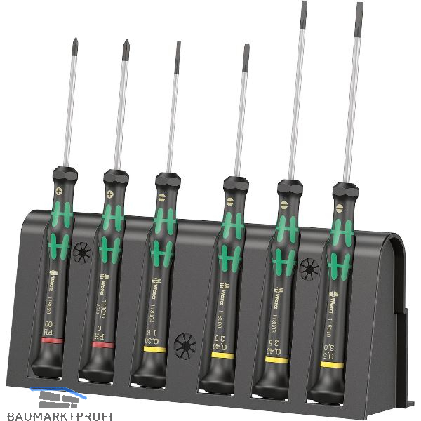 Hochwertiger Wera Micro Schraubendrehersatz für feinmechanische Verschraubungen. Durch Abstützen der Hand auf der Drehkappe und die Schnelldrehzone unterhalb der Drehkappe ist blitzschnelles Zwirbeln möglich. Kraftzone mit integrierten Weichzonen sorgt für die Übertragung hoher Löse- und Anzugsmomente. Präzisionszone für den richtigen Drehwinkel bei Justierarbeiten. Wera Black Point-Spitze bietet Passgenauigkeit und optimierten Korrosionsschutz. Inklusive praktischem Rack zur übersichtlichen Aufbewahrung der Schraubendreher.