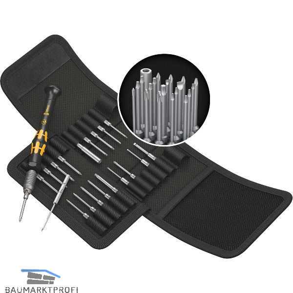 Kraftform Kompakt Micro-Set für feinmechanische Anwendungen. Geeignet für die Aufnahme von Bits mit 4 mm Halfmoon-Antrieb (Wera Reihe 9) und Bits mit 4 mm HIOS-Antrieb (Wera Reihe 21). Elektrischer Oberflächenwiderstand ? 109 Ohm zum sicheren Schutz vor elektrostatischer Energie. Gefertigt nach DIN EN 61340-5-1. Kompaktes Griff-/Wechselklingen-System für blitzschnellen Klingenaustausch. Bits für hand- und maschinenbetätigte Verschraubungen.Freilaufende Betätigungshülse zur einfachen Führung des Werkzeugs während des Schraubvorgangs. Einsatz z.B. an Smartphones, Mobiltelefonen, Kameras, Elektronikgeräten, in Dentallaboratorien und Zahnarztpraxen.