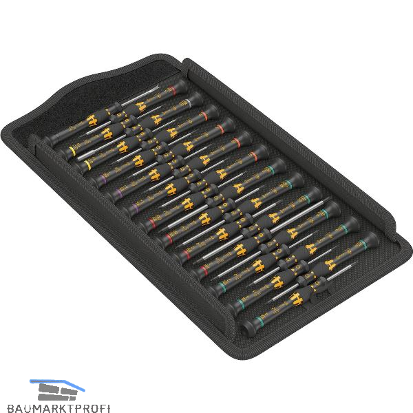 Elektrostatisch sicheres Werkzeug durch Oberflächenwiderstand von ? 10^9 Ohm. Wera Black Point-Spitze bietet Passgenauigkeit und optimierten Korrosionsschutz. Enthaltene Profile besonders geeignet für den Service an Mobiltelefonen, Tablets und Laptops/Computern. Mit Werkzeugfinder "Take it easy" Farbkennzeichnung nach Profilen und Größenstempelung. Aufbewahrung und Transport in robuster textiler Tasche, so ist das Werkzeug gut geschützt und immer schnell zur Hand.