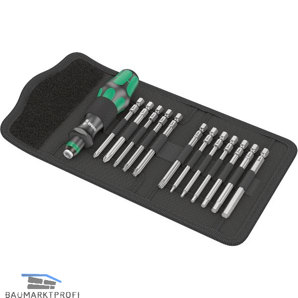 Kompaktes 13-teiliges Schraubwerkzeug-Set für Fahrradanwendungen, auch für den mobilen Einsatz. Praktisches Sortiment zur selbstständigen Durchführung von Montagearbeiten und Reparaturen. Leichte und Robuste Falttasche mit zwölf 89 mm langen Bits. Ergonomischer Kraftform Bit-Handhalter mit Schnellwechselfutter Rapidaptor.