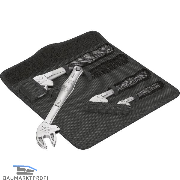 Selbstjustierend. Zupackend. Ratschend. Stufenlos und parallel geführten Backen ersetzen mehrere Maulschlüssel-Einzelabmessungen. Benötigte Größe stellt sich beim Ansetzen an der Sechskant-Mutter oder -Schraube stufenlos von selbst ein. Der integrierte Hebelmechanismus klemmt die Sechskant-Schraube bzw. Mutter zwischen den Backen sicher ein. Für das schnelle und durchgängige Schrauben ohne Absetzen sorgt die Ratschenfunktion. Rückschwenkwinkel von nur 30°. Ein-Schenkel-Konstruktion in Verbindung mit der Ratschenfunktion und dem Eckweitenprisma ermöglicht das Arbeiten auch in engen Bauräumen. Die Tasche ist durch das Klettsystem auf der Rückseite zur Befestigung an Wand, Regal, Werkstattwagen und am Wera 2go System geeignet.