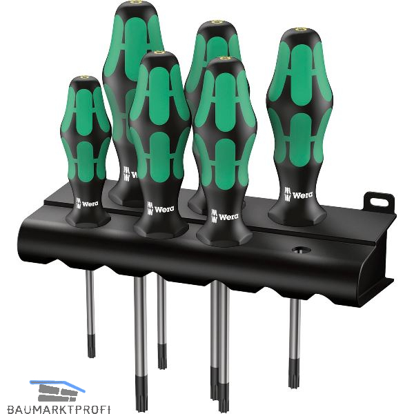 Schraubendrehersatz für TORX® Schrauben mit Haltefunktion. Mehrkomponentiger Kraftform Griff für schnelles und schonendes Arbeiten. Mit Haltefunktion: Durch die aus der Flächenpressung zwischen der Abtriebsspitze und Schraubenprofil resultierende Klemmkraft werden die Schrauben sicher auf dem Werkzeug gehalten. Der Sechskantabrollschutz verhindert lästiges Wegrollen am Arbeitsplatz. Mit Griffkennzeichnung zum leichteren Finden und Sortieren des Werkzeugs. Mit Aufbewahrungs-Rack zur Wandmontage.
