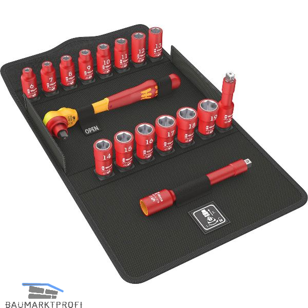 Unglaublich kompakte Satzanordnung für viel Werkzeugauf engem Raum.Stückgeprüfte Knarre, Nüsse und Verlängerungen für sicheres Arbeiten bei der zugelassenen Spannung von 1.000 V.Geringes Gewichtund Volumen für vereinfachte Mobilität. Leichtgängiger Drehmechanismus fürsicheren Halt und einfache Entnahmeder VDE Nüsse.