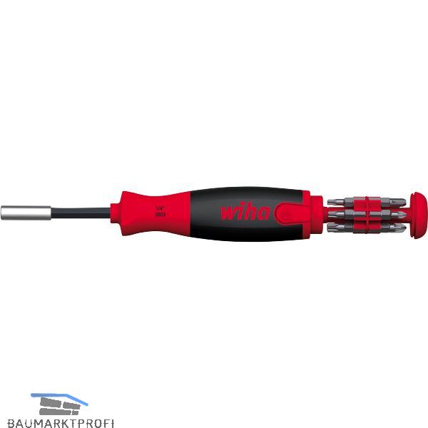 Die Alternative zum Schraubendrehersatz. Bits kompakt im Griffkörper verstaut. Klinge aus Chrom-Vanadium-Stahl, durchgehend gehärtet. Ergonomischer Wiha SoftFinish® Mehrkomponentengriff mit Abrollschutz. Bitaufnahme aus rostfreiem Stahl, mit starkem Neodym-Magnet.