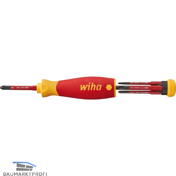 Der kompakte und leichte PocketMax® von Wiha passt problemlos in jede Hemd- und Hosentasche und ist der ideale Begleiter für jeden Elektriker. Das im Griff sicher verstaute Bitdepot präsentiert sich mit vier slimBits. Dank einer magnetischen Schließfunktion kann das Bitdepot spielend leicht geöffnet werden. Beim Verschließen gleitet das Bitdepot zielstrebig und leicht in den Schaft zurück. Ein weiterer Pluspunkt ist die drehbare Kappe, welche eine komfortable Handhabung gewährleistet. Sowohl der Magazin-Bithalter als auch die enthaltenen slimBits sind nach der internationalen Norm IEC 60900 zertifiziert. Die schlanken, 75mm langen slimBits gewähren durch die im vorderen Bereich vollständig in den Bit integrierte Schutzisolation einen perfekten Zugriff auf tiefliegende Schraub- oder Federklemmen.