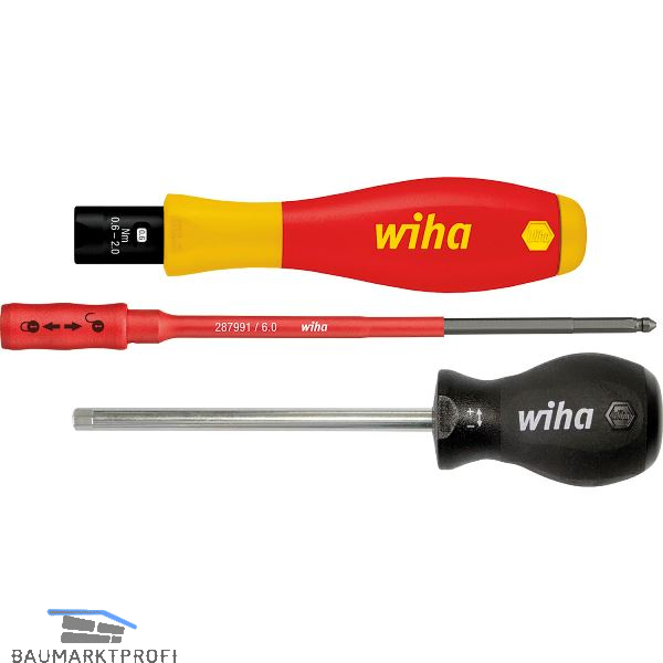 Drehmoment stufenlos einstellbar mit Einstellwerkzeug Torque-Setter. Ergonomischer Mehrkomponentengriff, Schutzisolation 1.000 V AC, GS-geprüft. Optimal an Drehmomentbereich angepasste Griffgröße. Klicksignal beim Erreichen des eingestellten Drehmomentwerts. Kompatibel mit allen Klingen der Serie 2831 in Verbindung mit dem Bithalter 2879.