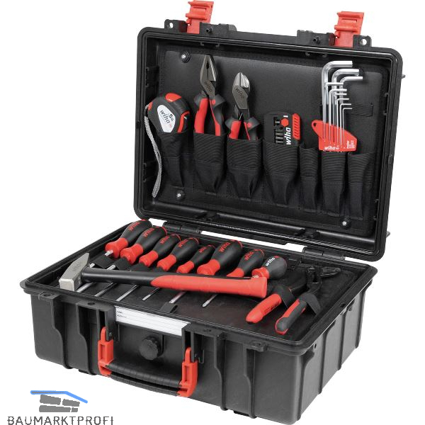 Der kompakte und handliche Koffer bietet neben einer Grundausstattung an hochwertigen Handwerkzeugen, ausreichend Platz für zusätzliches Werkzeug dank 28 Schlaufen und Fächern sowie der geräumigen Bodenschale. Das Werkzeug kann dabei übersichtlich aufbewahrt und mühelos entnommen werden. Der ergonomische Zweikomponentengriff ermöglicht ein angenehmes Tragegefühl des Koffers. Darüber hinaus ist das Öffnen und Schließen des Koffers dank den Gasdruckdämpfern ein Leichtes. Diese verhindern ein ungewolltes Zufallen des Kofferdeckels und schützen so vor eingequetschten Fingern. Der aus widerstandsfähigem Polypropylen (PP) gefertigte Koffer ist darüber hinaus besonders robust und stoßfest, sodass der Werkzeug-Inhalt zuverlässig geschützt wird. Die Schlossvorrichtung und ein Luftdruckausgleichsventil ermöglichen außerdem einen sicheren Transport des Werkzeugkoffers im Flugzeug.