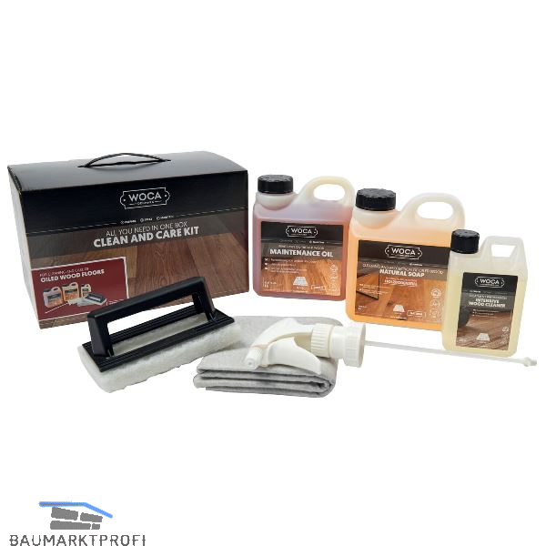 Box mit allen erforderlichen Produkten zur richtigen Pflege für geölte und gewachsten Holzoberflächen.